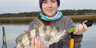 Black drum are another of the drum species we have here in SC. While reaching upwards of 80 lbs most are in the 2 lb to 15 lb range in Winyah bay and Murrells inlet but still offer that drum fight! Cut bait and shrimp on a bottom rig is the ringing dinner bell these guys are looking for.
